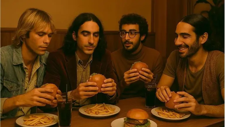 Like this promotional photo showing the band sharing a burger, except the hands in the photo look subtly distorted, like they were drawn by a machine that missed thumbs. Then there’s the music itself: well-produced but missing the raw moments that usually come with human-made art.